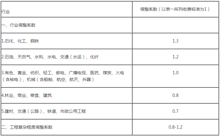 3.根據(jù)行業(yè)特點和各行業(yè)內(nèi)部不同類別工程的復(fù)雜程度,計算咨詢費用時可分別乘以行業(yè)調(diào)整系數(shù)和工程復(fù)雜程度調(diào)整系數(shù)(見附件二)。
