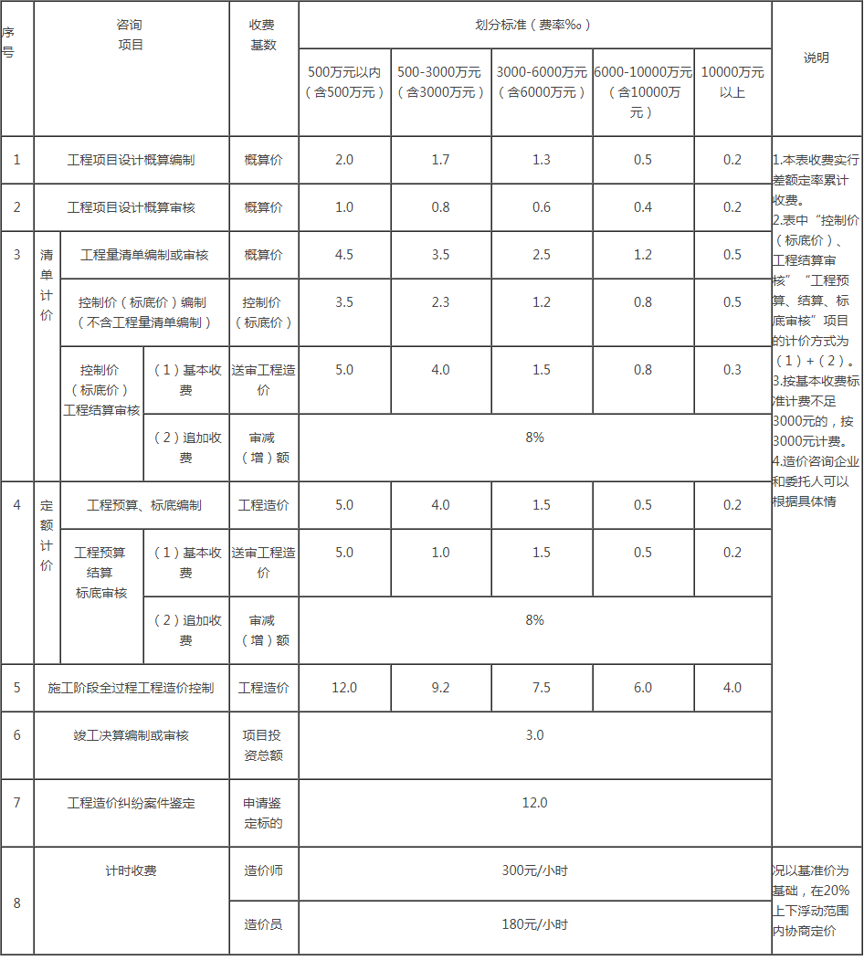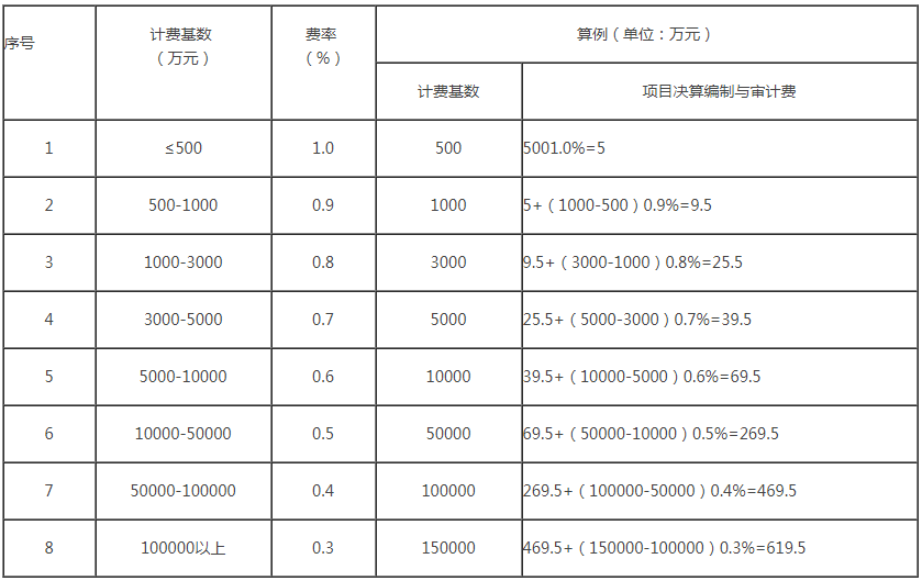 以工程施工費與設(shè)備購置費之和作為計費基數(shù),采用差額定率累進(jìn)法計算。