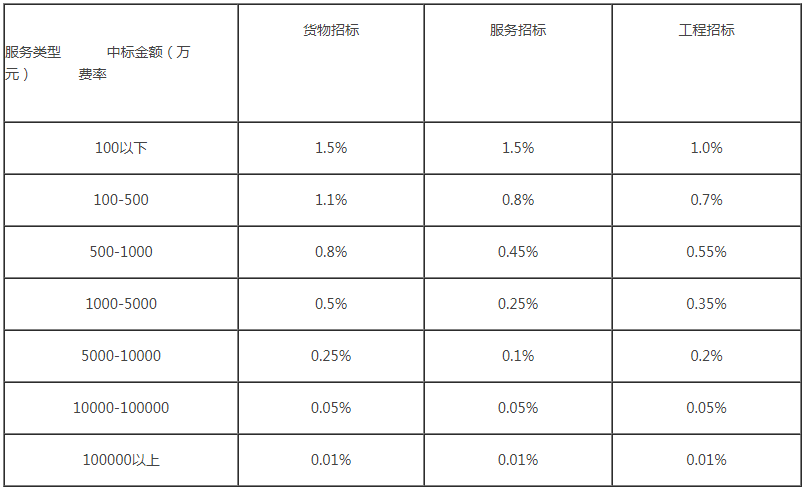 根據(jù)國家計委計價[2002]1980號文,工程招標(biāo)代理服務(wù)收費以中標(biāo)金額為基礎(chǔ)按差額定率分檔累進(jìn)法計算,具體見下表: