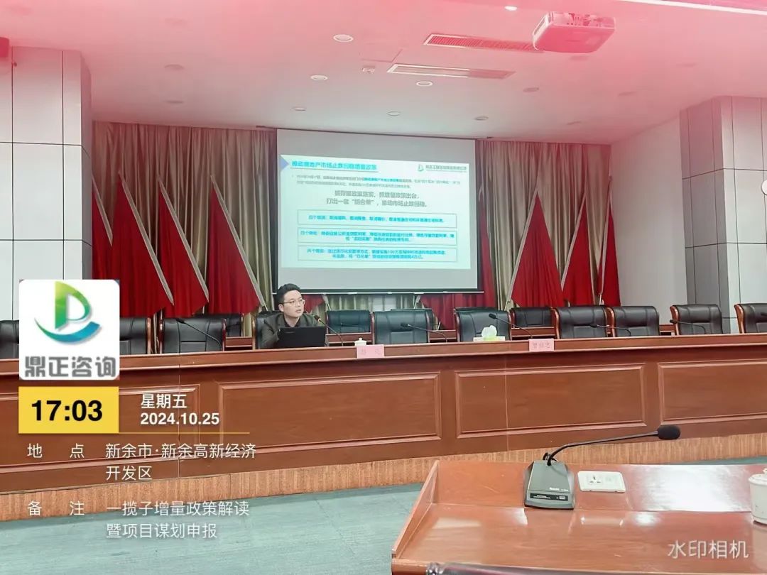 自9月下旬以來,國務(wù)院等多部門密集發(fā)布了一攬子增量政策,并引發(fā)了社會(huì)各界的廣泛關(guān)注。為搶抓增量政策窗口期,提升地方政府項(xiàng)目謀劃儲(chǔ)備質(zhì)量和項(xiàng)目謀劃水平,精準(zhǔn)擴(kuò)大有效投資。10月25日,鼎正副總經(jīng)理彭亮受邀為新余高新區(qū)政府作《一攬子增量政策解讀暨項(xiàng)目謀劃申報(bào)》的專題培訓(xùn)。