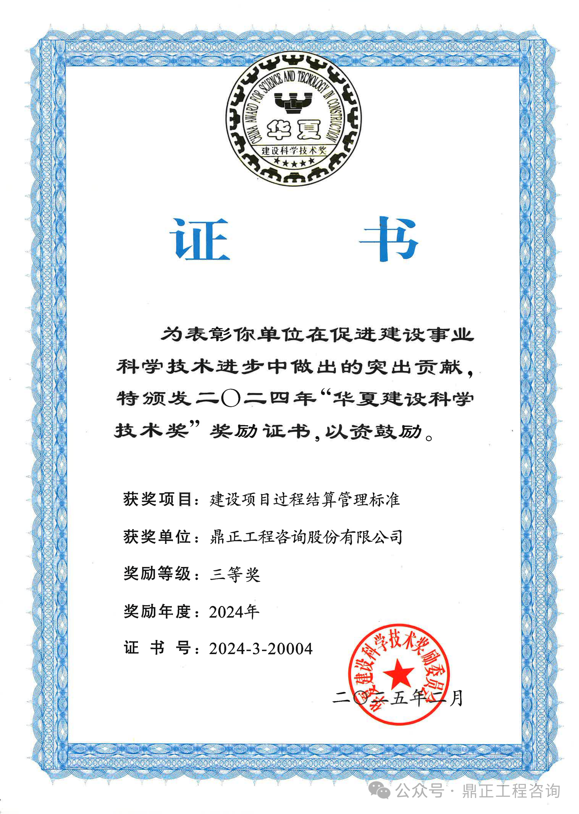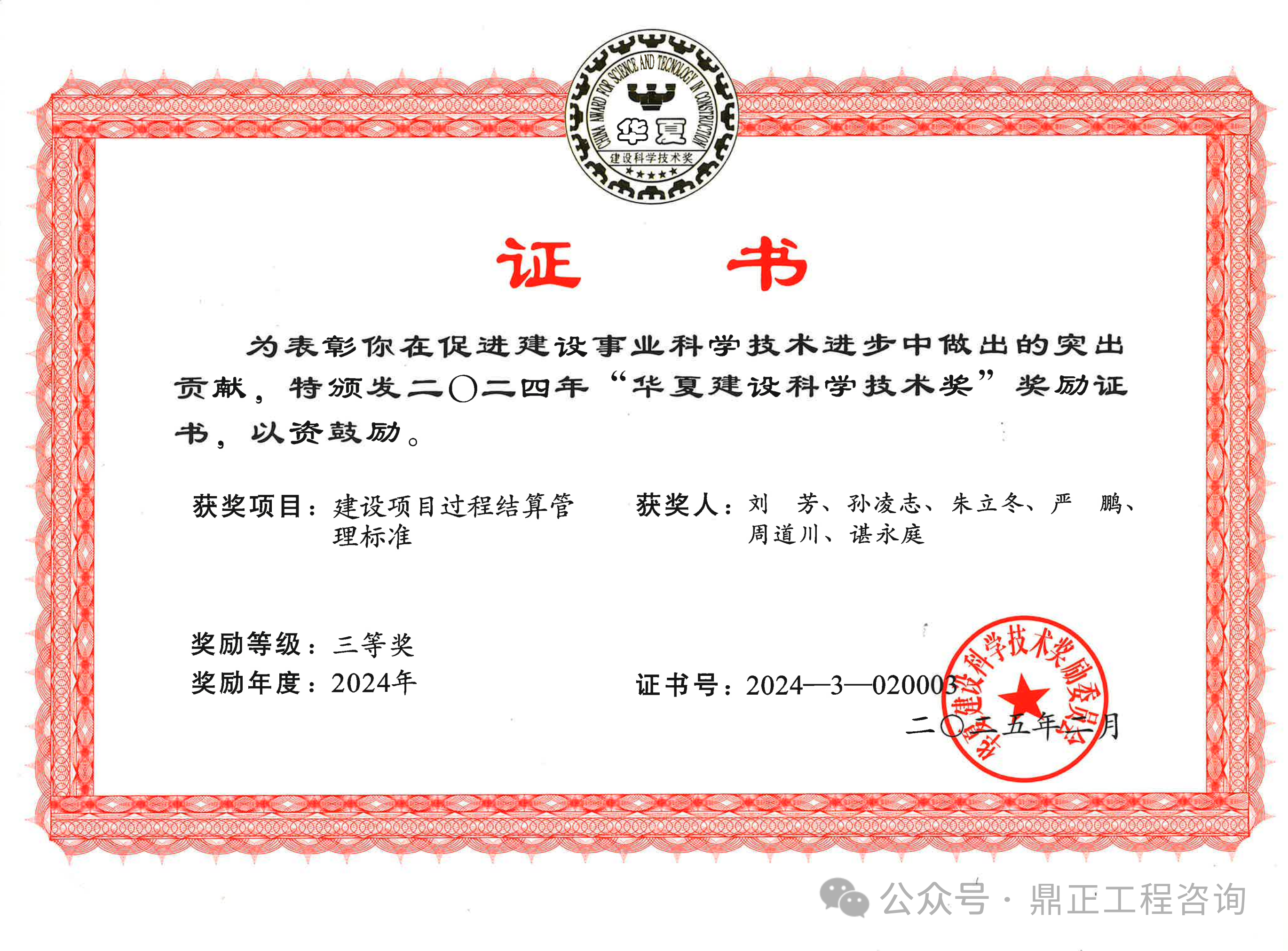 鼎正參與編制的《建設項目過程結算管理標準》(T/CECS 1178-2022)通過專業組和評審委員會的兩級評審,從700余個報送項目中脫穎而出,榮獲2024年度華夏建設科學技術獎三等獎。