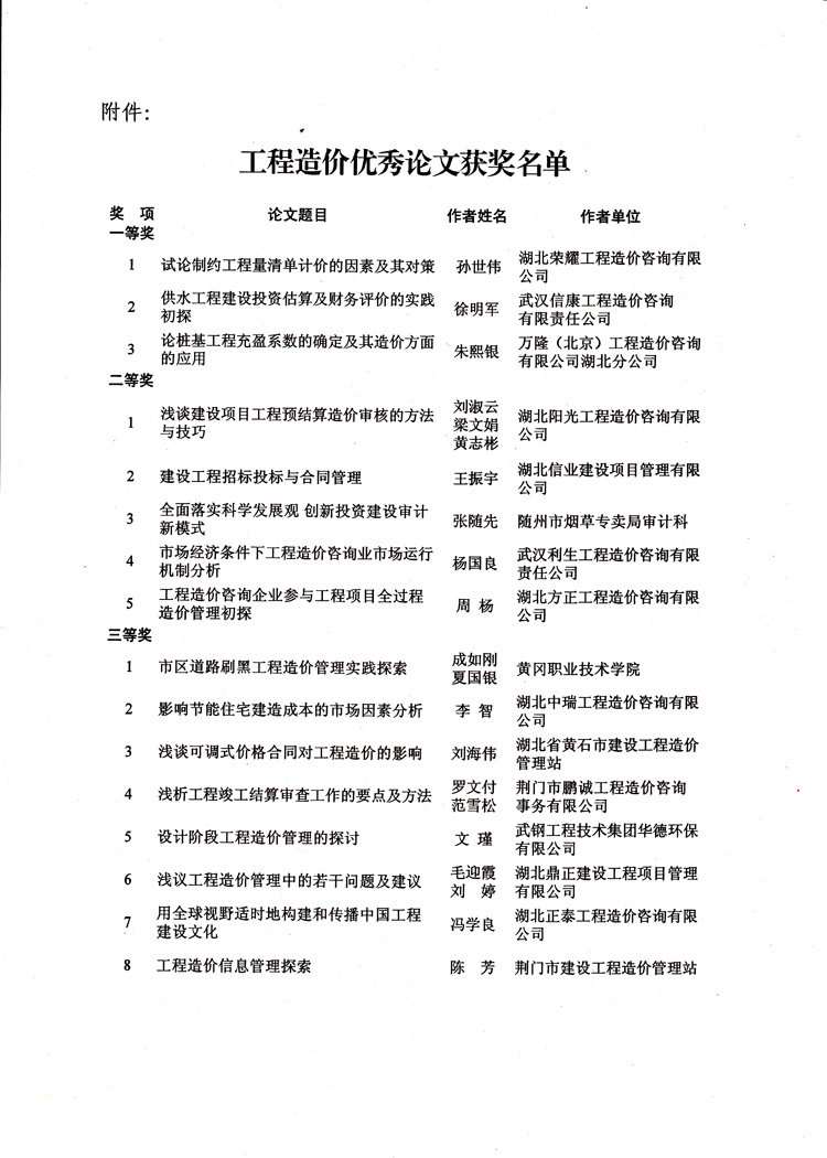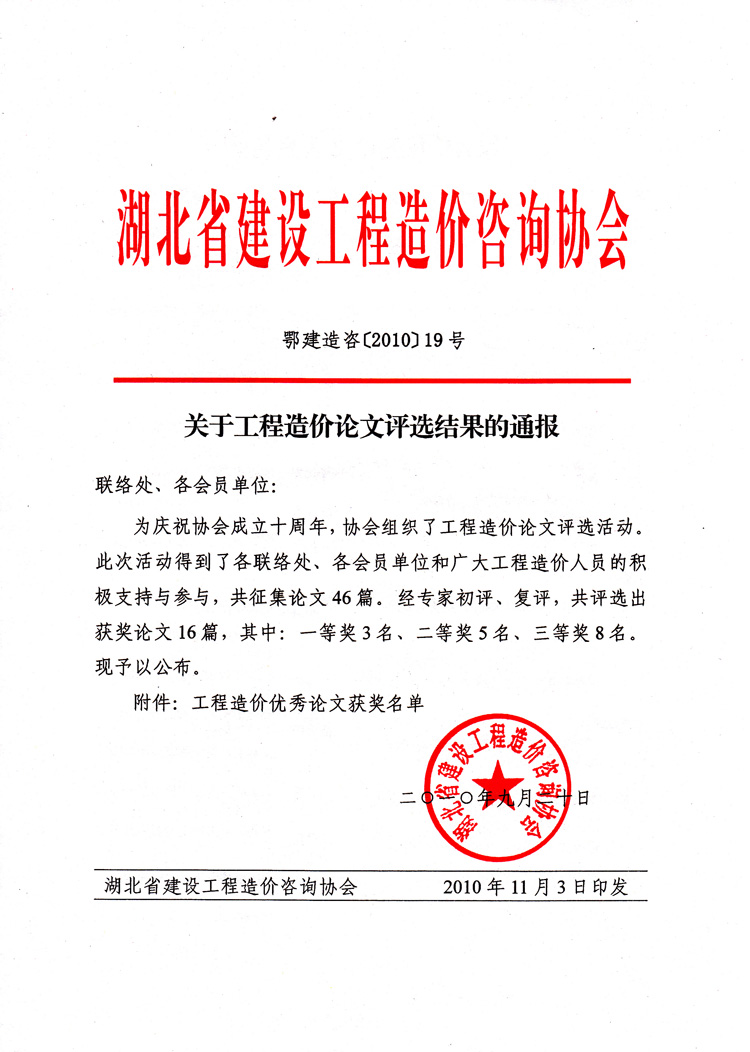 熱烈祝賀我公司在湖北省建設(shè)工程造價(jià)咨詢協(xié)會(huì)十周年之際舉辦的“工程造價(jià)論文評選活動(dòng)”中獲得三等獎(jiǎng)。