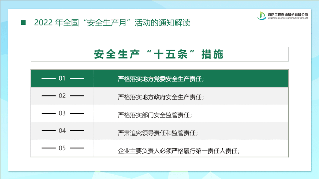 2022年全國“安全生產(chǎn)月”重點工作要求,1.深入學習貫徹習近平總書記關于安全生產(chǎn)重要論述,推動落實安全生產(chǎn)十五條措施;2.宣傳貫徹安全生產(chǎn)法,推動“第一責任人”守法履責;3.持續(xù)開展“安全生產(chǎn)萬里行”活動,分類強化警示教育;4.廣泛開展“安全宣傳咨詢日”和安全宣傳“五進”活動,提升社會公眾安全意識和自救互救能力。