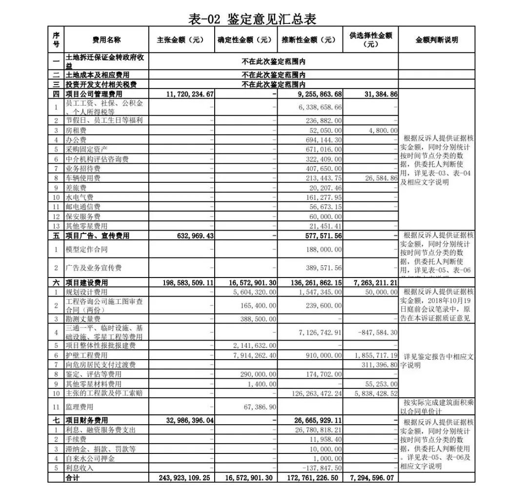 由于本項(xiàng)目涉及費(fèi)用項(xiàng)目、金額均較大,《鑒定意見書》中分別根據(jù)證據(jù)情況、國家文件規(guī)定、解除合同時(shí)間等分類方式,逐項(xiàng)對金額進(jìn)行了分類,并附加相關(guān)說明,為法庭判決提供了數(shù)據(jù)支撐。最終鑒定確定性金額16,572,901.30元,推斷性金額172,761,226.50 元,供選擇性金額7,294,596.07 元,具體詳表-02