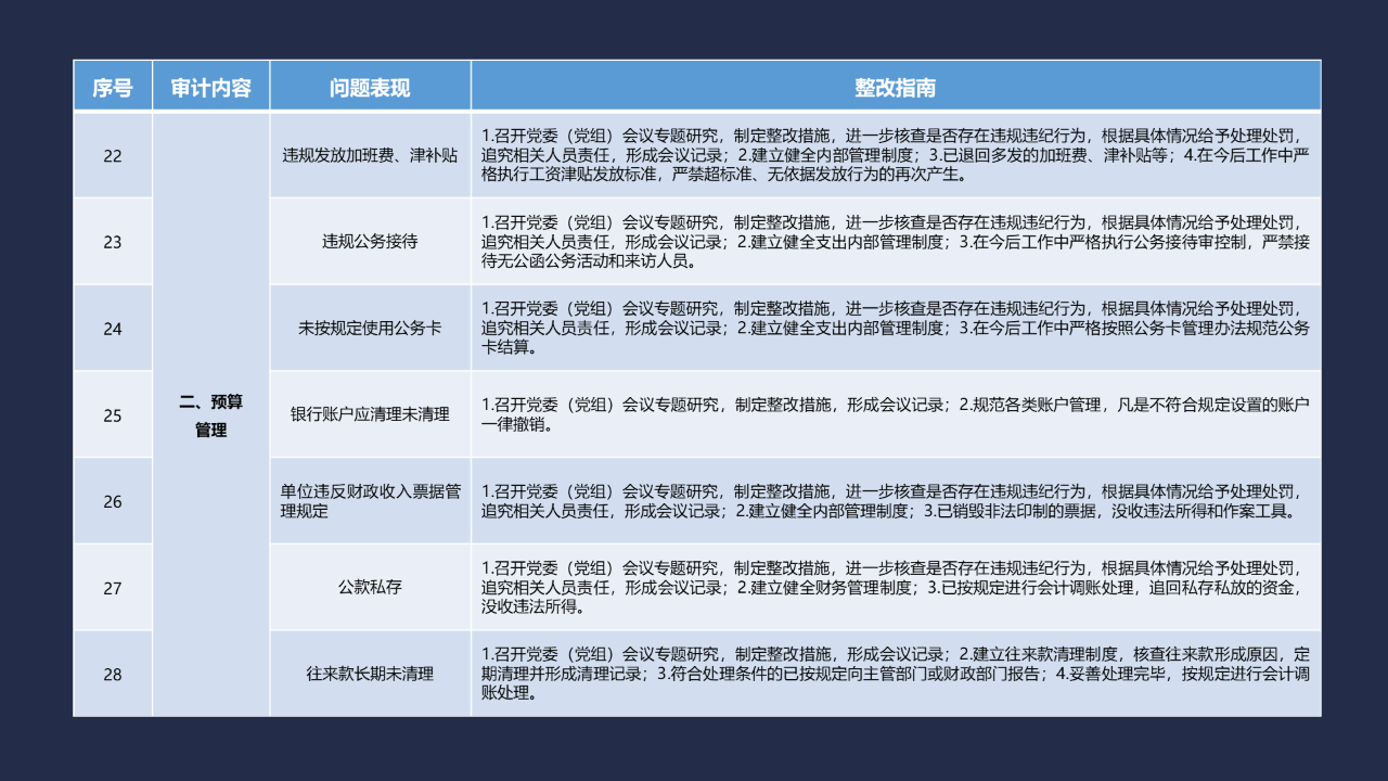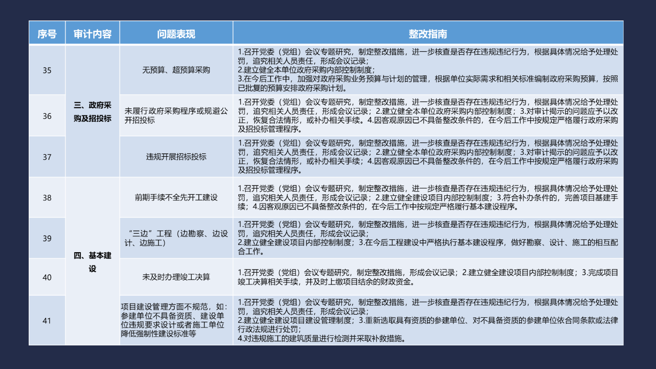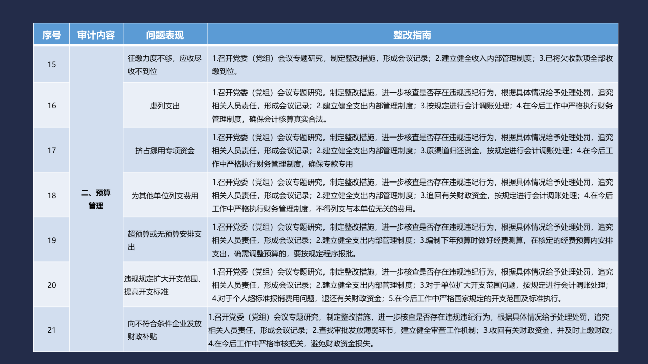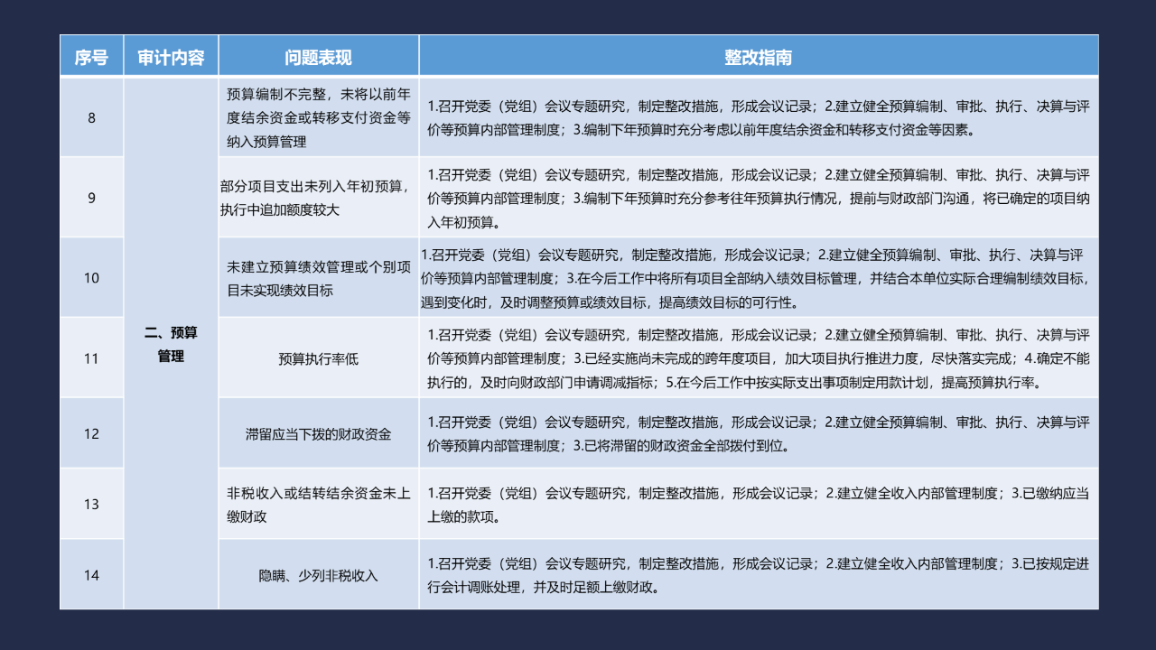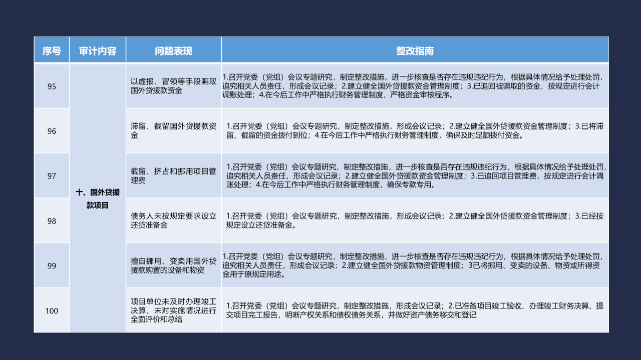 《整改指南100條》按照常見的重大政策措施落實(shí)、預(yù)算管理、政府采購及招投標(biāo)、基本建設(shè)、內(nèi)控管理、企業(yè)管理、自然資源、社保資金及安居工程、金融管理、國外貸援款共10類審計內(nèi)容進(jìn)行問題分類,列舉了100個常見問題并給出相對應(yīng)的整改方法說明,供審計機(jī)關(guān)和整改責(zé)任單位在審計整改工作中參照落實(shí)。