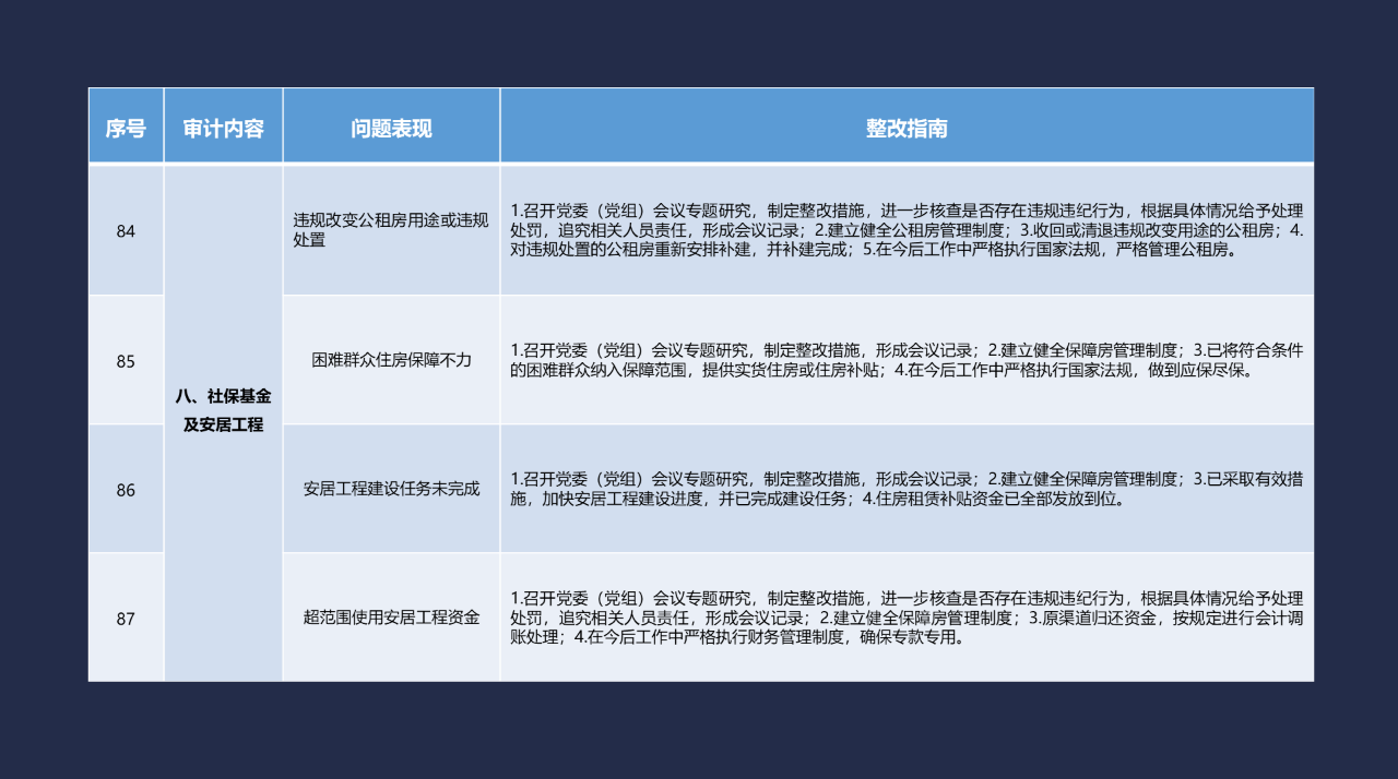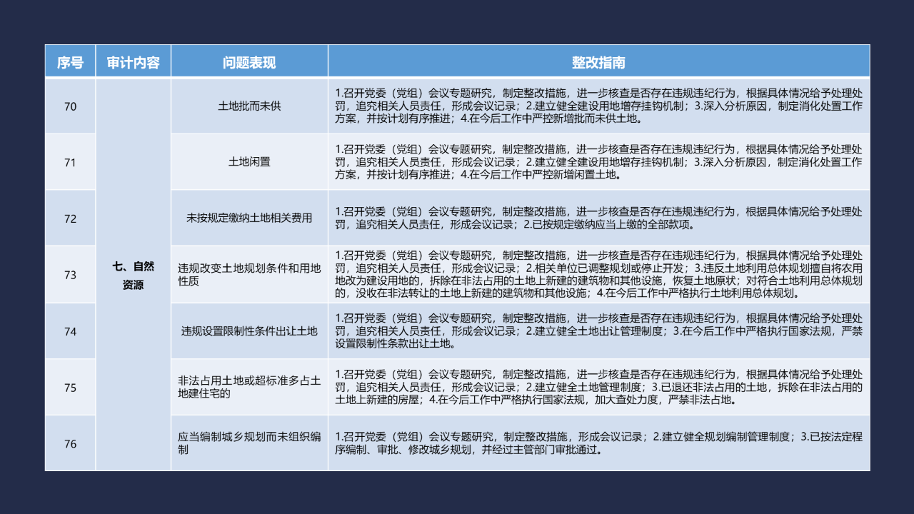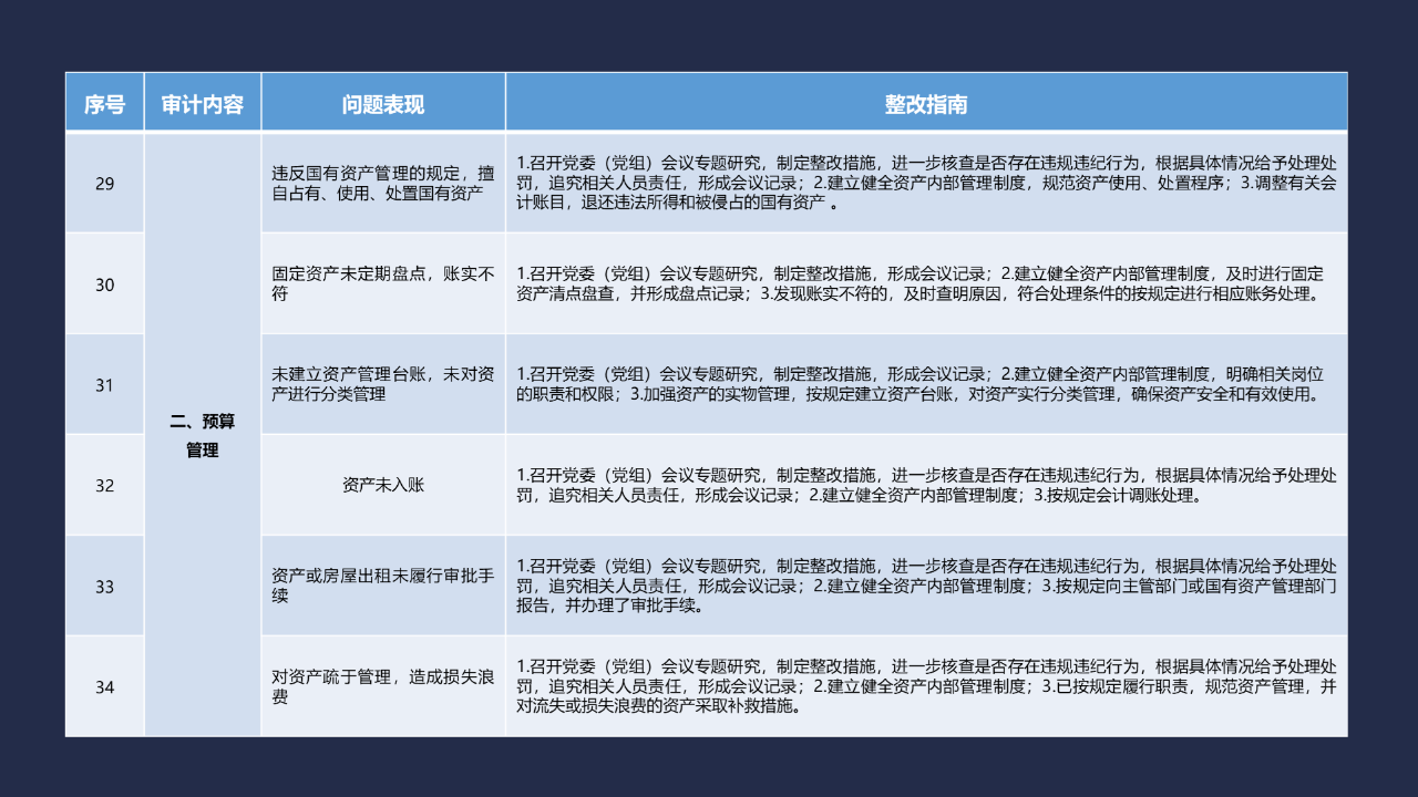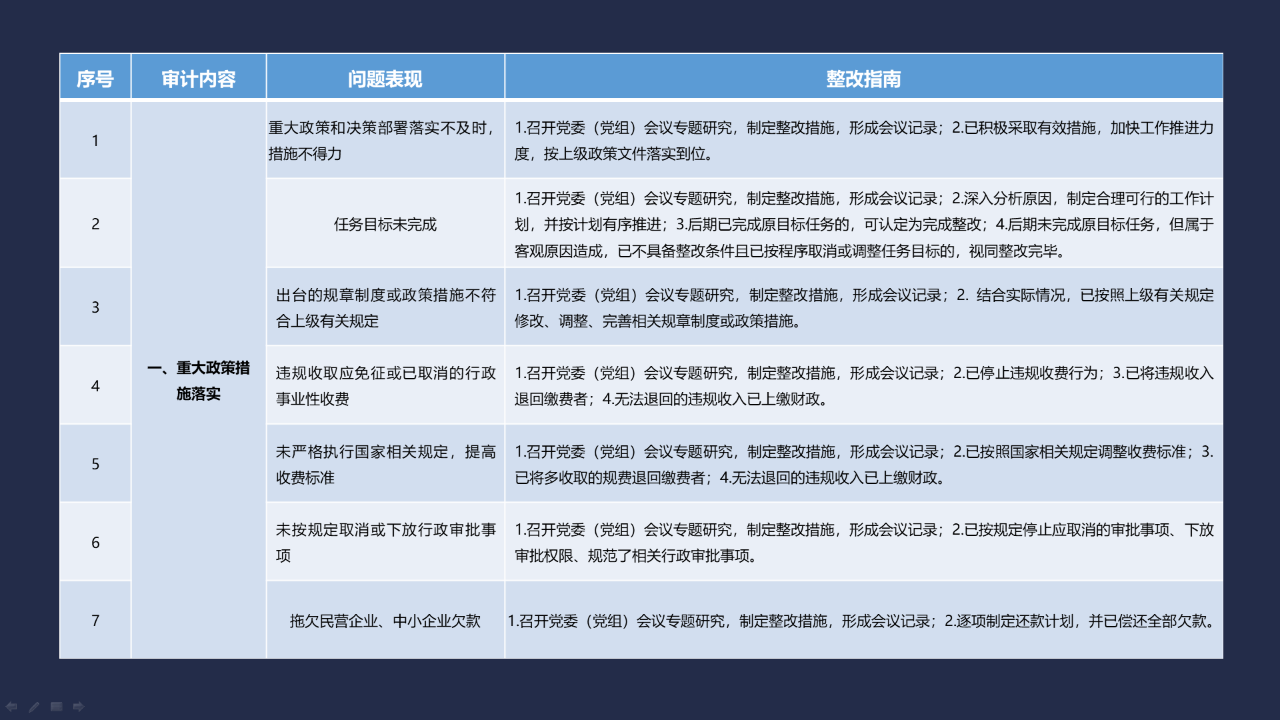 《整改指南100條》按照常見的重大政策措施落實(shí)、預(yù)算管理、政府采購及招投標(biāo)、基本建設(shè)、內(nèi)控管理、企業(yè)管理、自然資源、社保資金及安居工程、金融管理、國外貸援款共10類審計內(nèi)容進(jìn)行問題分類,列舉了100個常見問題并給出相對應(yīng)的整改方法說明,供審計機(jī)關(guān)和整改責(zé)任單位在審計整改工作中參照落實(shí)。