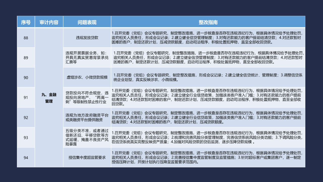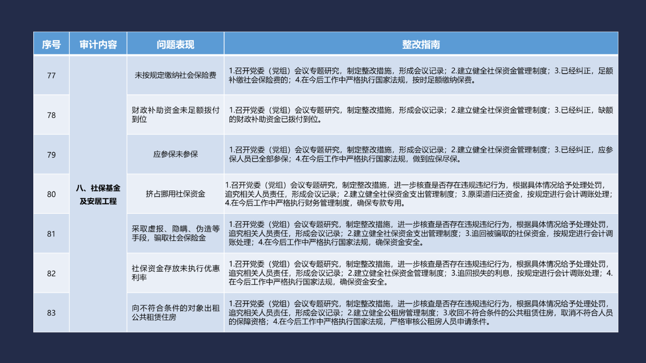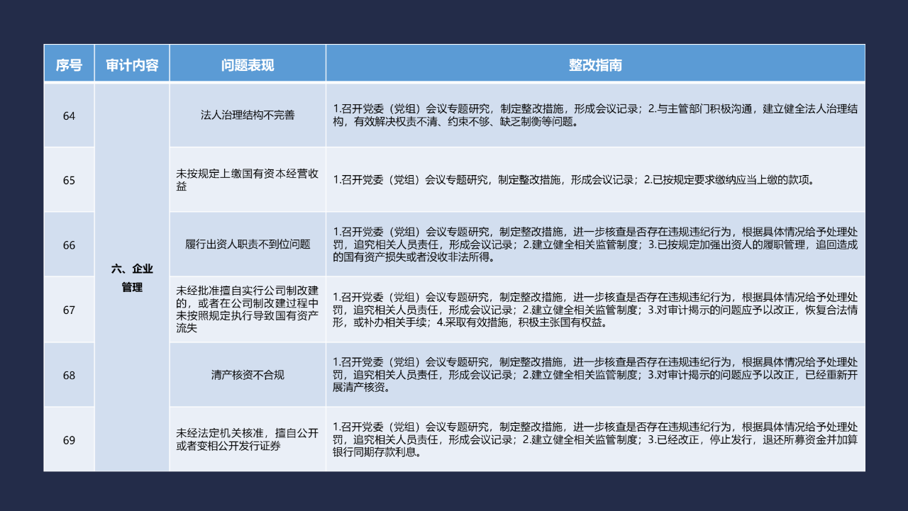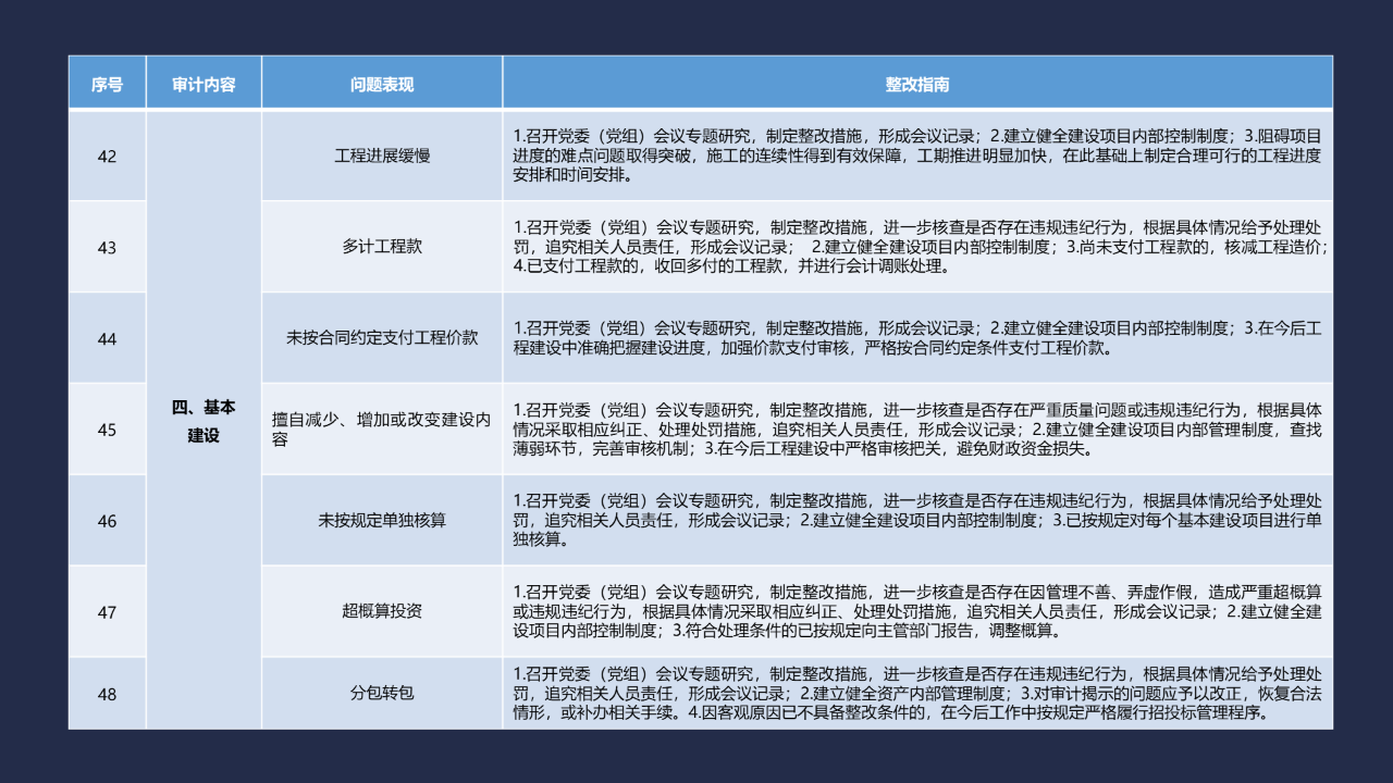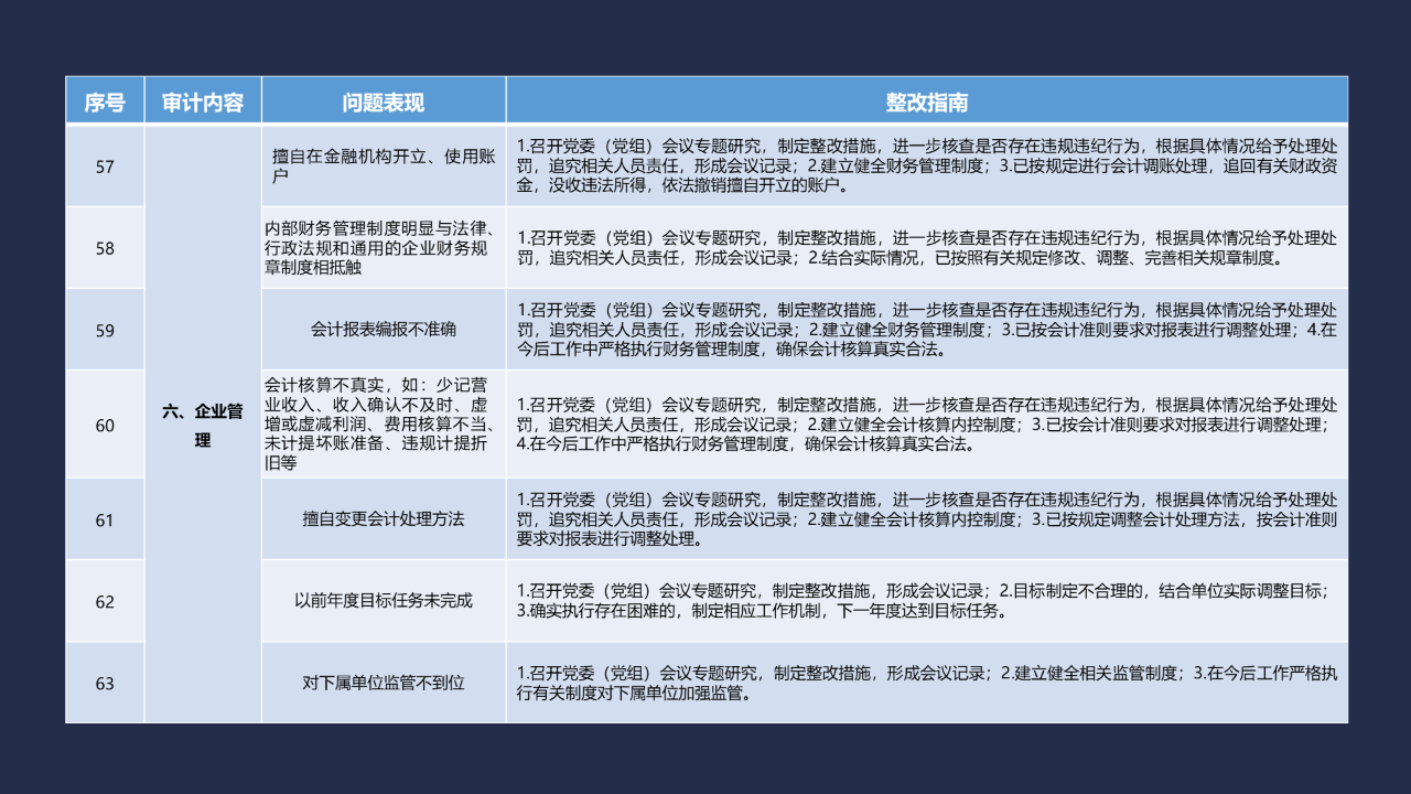 《整改指南100條》按照常見的重大政策措施落實(shí)、預(yù)算管理、政府采購及招投標(biāo)、基本建設(shè)、內(nèi)控管理、企業(yè)管理、自然資源、社保資金及安居工程、金融管理、國外貸援款共10類審計內(nèi)容進(jìn)行問題分類,列舉了100個常見問題并給出相對應(yīng)的整改方法說明,供審計機(jī)關(guān)和整改責(zé)任單位在審計整改工作中參照落實(shí)。