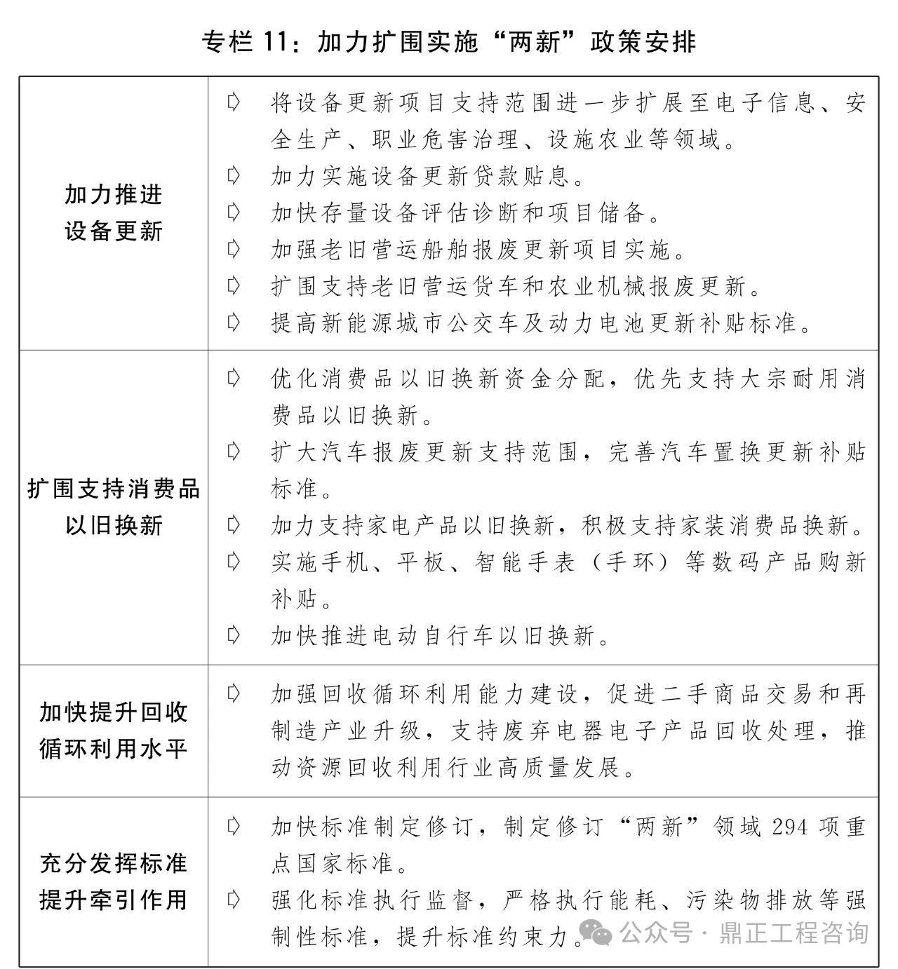 安排超長期特別國債5000億元支持大規(guī)模設(shè)備更新和消費(fèi)品以舊換新,統(tǒng)籌投資、財(cái)政、金融等綜合性政策,深入推進(jìn)設(shè)備更新、消費(fèi)品以舊換新、回收循環(huán)利用、標(biāo)準(zhǔn)提升四大行動(dòng)。進(jìn)一步加大重點(diǎn)領(lǐng)域設(shè)備更新項(xiàng)目支持力度,加力實(shí)施設(shè)備更新貸款貼息,加快存量設(shè)備評(píng)估診斷和項(xiàng)目儲(chǔ)備。進(jìn)一步支持消費(fèi)品以舊換新,擴(kuò)大汽車報(bào)廢更新支持范圍,完善汽車置換更新補(bǔ)貼標(biāo)準(zhǔn),實(shí)施手機(jī)、平板等數(shù)碼產(chǎn)品購新補(bǔ)貼,積極支持家裝消費(fèi)品換新,簡化補(bǔ)貼申領(lǐng)和支付流程,完善資金監(jiān)管機(jī)制,嚴(yán)厲打擊價(jià)格欺詐和違規(guī)騙補(bǔ)套補(bǔ)行為。