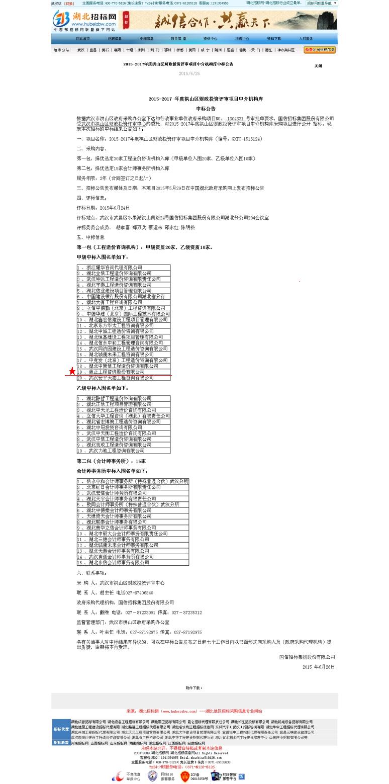 【經(jīng)營(yíng)成果】我司入圍2015-2017 年度洪山區(qū)財(cái)政投資評(píng)審項(xiàng)目中介機(jī)構(gòu)庫(kù)