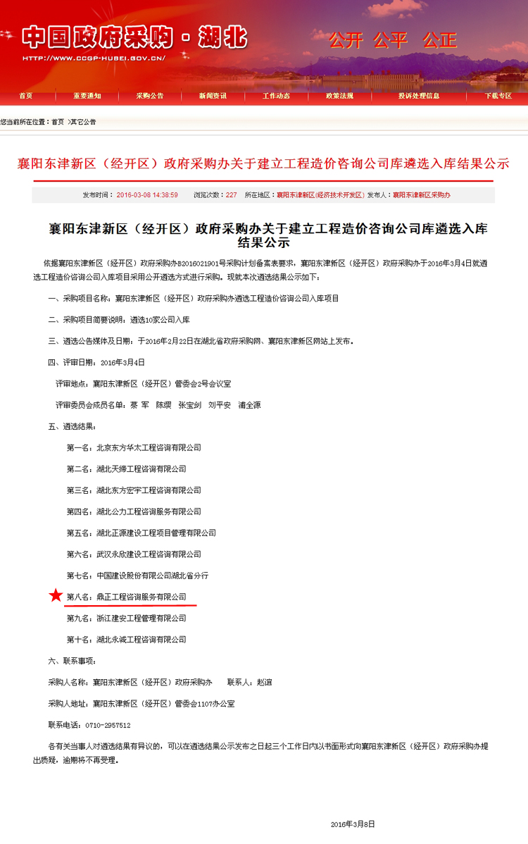 【經(jīng)營成果】我司入圍襄陽東津新區(qū)(經(jīng)開區(qū))政府采購辦工程造價(jià)咨詢公司庫