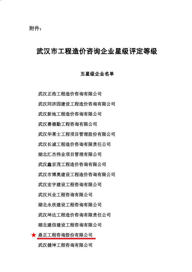 我司獲武漢市工程造價(jià)咨詢企業(yè)星級(jí)評(píng)定五星級(jí)企業(yè)稱號(hào)