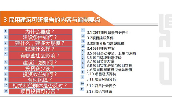 上午,來自工程咨詢一部的余國秋做了《民用建筑可行性研究報(bào)告編制要點(diǎn)與實(shí)務(wù)》的主題分享。余國秋從可行性研究基本認(rèn)識、民用建筑可行性研究報(bào)告編制要點(diǎn)、可行性研究實(shí)務(wù)三個(gè)方面展開,重點(diǎn)闡述了做可行性研究報(bào)告的必要性,怎么做可行性研究報(bào)告。